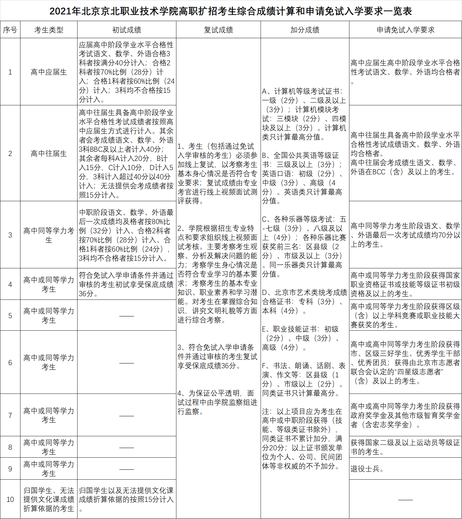 初试成绩、复试成绩、加分成绩计算及免试入学申请条件详见“2021年taptap点点体育高职扩招考生综合成绩计算和免试入学申请要求一览表”。